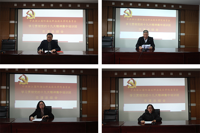 在结业会议上,中层干部汪益兵、韩开封、刘笑菊、李晓璐分别代表各自小组围绕学习研讨情况和培训心得体会作交流汇报。学校党委委员、纪委书记、组织部部长江爱芬总结发言,并提出了四点希望:一是要学懂弄通做实十九大精神;二是要敢于创新,增强责任感;三是要以十九大精神为指导武装头脑,解决实际问题;四是要增强服务意识,主动作为。