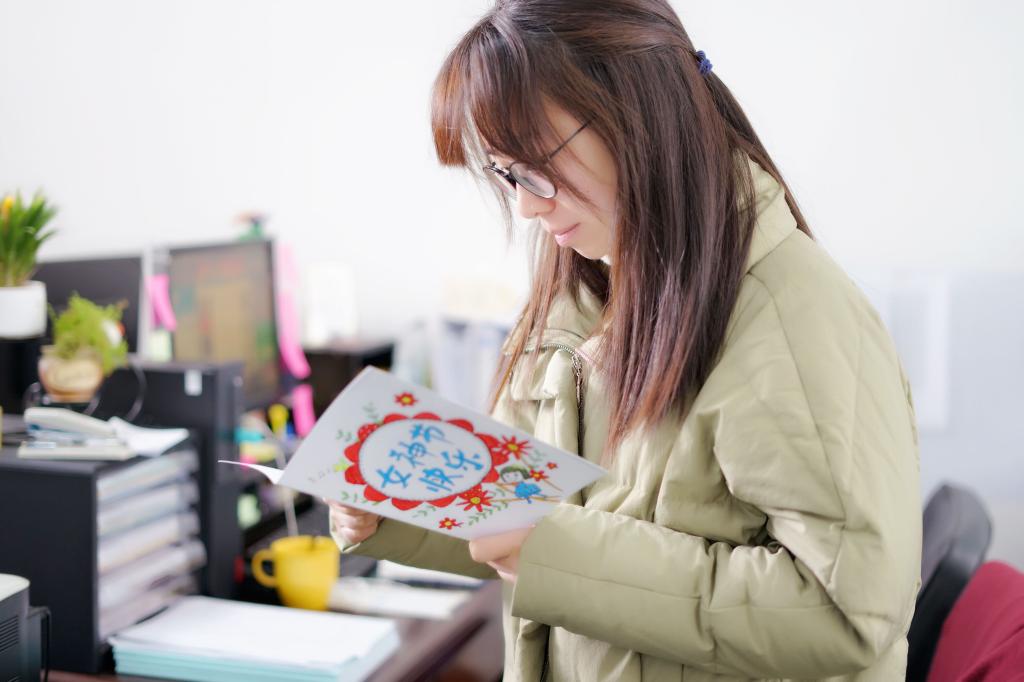 3月7日下午,海洋旅游学院团学会的成员们集聚在海邮驿站,忙碌准备着。大家一起用心写祝福,手绘卡片,短短几个小时就完成了四十几份彩铅、水彩卡片制作。每一张卡片都是量身定制,每一句祝福都饱含师生情谊。节日当天,团学干部们亲手把制作的贺卡送到女教师手中,走心的节日问候深深打动了女教师们。(邬加白)