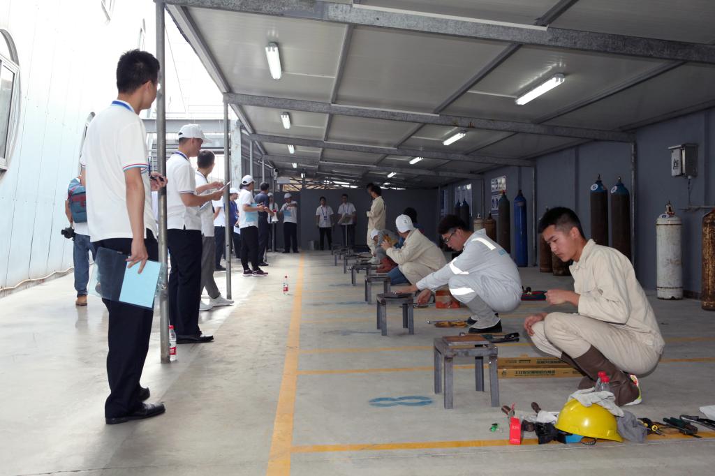 作为经典的轮机员技能展示项目,金工工艺要求选手们利用车、钳、焊工艺,在150分钟内加工一块带孔盲板和一只带管子的法兰,要求安全操作、符合规范,工艺良好,分工协作并动作迅速。各个院校队选派5名轮机专业学生,分别完成气割、车工、焊接、钳工和装配。下午,我校选手顺利完成该赛项,最终成绩须待明天另外8支院校队比赛结束后揭晓。