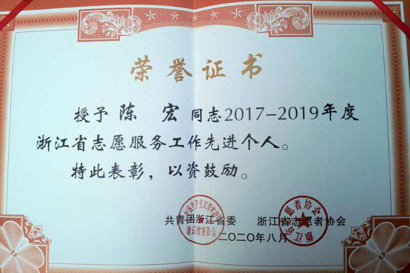 陈宏同学荣获“浙江省志愿服务先进个人”荣誉称号
