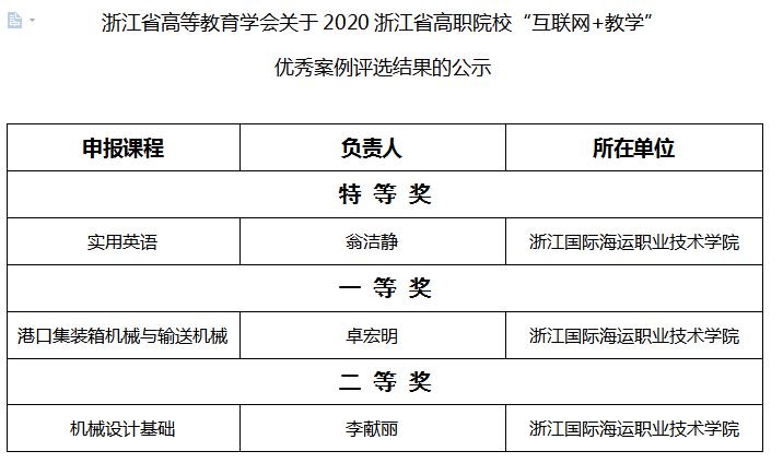 近日,浙江省高等教育学会组织开展了2020浙江省高职院校“互联网+教学”优秀案例评选活动,经学会组织专家评审、省教育厅相关处室审定并公示,我校喜获特等奖1项,一等奖1项,二等奖1项。