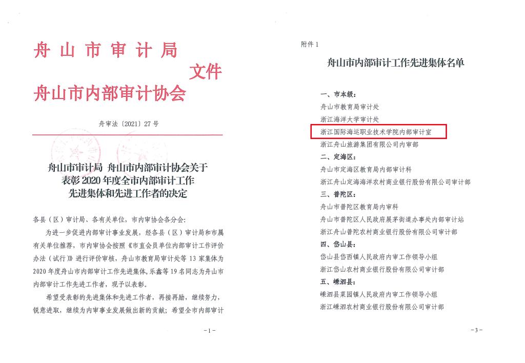 为进一步促进加强内部审计队伍建设,推动内部审计事业健康发展,舟山市审计局、舟山市内部审计协会开展了2020年度全市内部审计先进集体和先进工作者评选工作。经过申报、推荐、评审并报主管部门批准,评定13个先进集体和19位先进工作者。我校审计处获“2020年舟山市内部审计工作先进集体”荣誉称号。