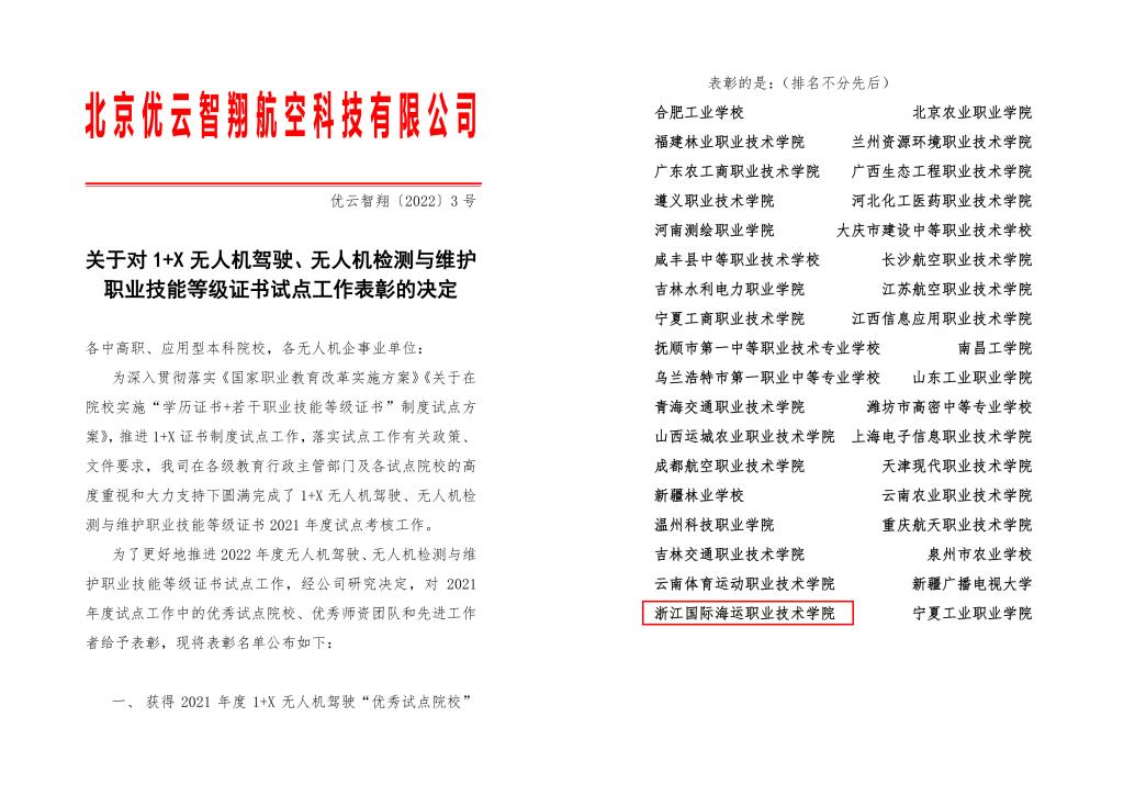 近日,1+X“无人机驾驶职业”教育培训评价组织召开了线上“1+X”无人机驾驶职业技能等级证书2021年度试点工作总结表彰会,我校海洋装备工程学院无人机应用技术专业主任卓宏明应邀参会。此次会议共有全国X证书试点院校相关负责人、教师、无人机相关企事业单位代表、无人机行业协会代表等近500人参会。会议主要对2021年证书开展情况及优秀代表表彰、试点经验交流、2022年度开展试点工作的总体安排以及院校参与试点的有关问题解答与交流讨论。我校荣获2021年度1+X无人机驾驶“优秀试点院校”,以表彰在2021年度1+X试点推进工作中所作出的突出贡献。
