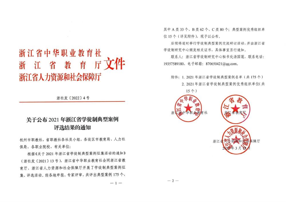 近日,浙江省中华职业教育社、省教育厅和人社厅联合发布《关于2021年浙江省学徒制典型案例评选结果的通知》,全省高职院校共评选了60个典型案例。我校《高质量培养国际海员,服务海洋强国战略》与《绿色石化专业群“双元共育、育训结合、一源多向”的现代学徒制人才培养模式的创新与实践》入选典型案例。