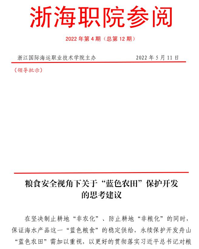 近日,校党委委员、副校长夏志刚牵头撰写的《粮食安全视角下关于“蓝色农田”保护开发的思考建议》决策参阅报告获舟山市委书记何中伟肯定性批示。