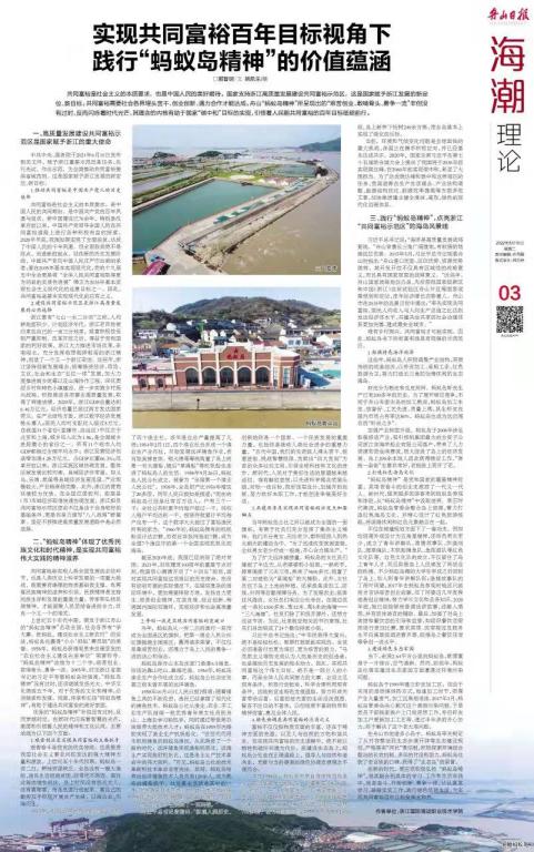 该文刊登在2022年5月10日《舟山日报》的海潮理论版,主要阐发了“蚂蚁岛精神”的时代价值,探讨了新时代的蚂蚁岛人民在“蚂蚁岛精神”引领下,在做强特色海洋经济、打造红色海岛文化、建设绿色生态家园方面的生动实践,点亮了浙江“共同富裕示范区”的海岛风景线。