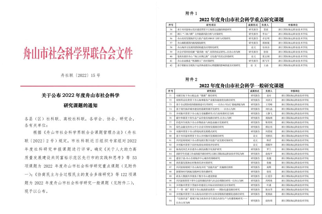 近日,舟山市社科联公布了《2022年度舟山市社会科学研究课题立项通知》,我校喜获34项课题立项,其中10项为重点研究课题,24项年度一般课题,创历史新高。今年我校共申报舟山市社科联课题73项,去年同期申报数为32项,立项16项(其中重点课题3项,一般课题13项);今年的申报数、立项数、重点数分别是去年同期的2.3倍、2.6倍、3.3倍。