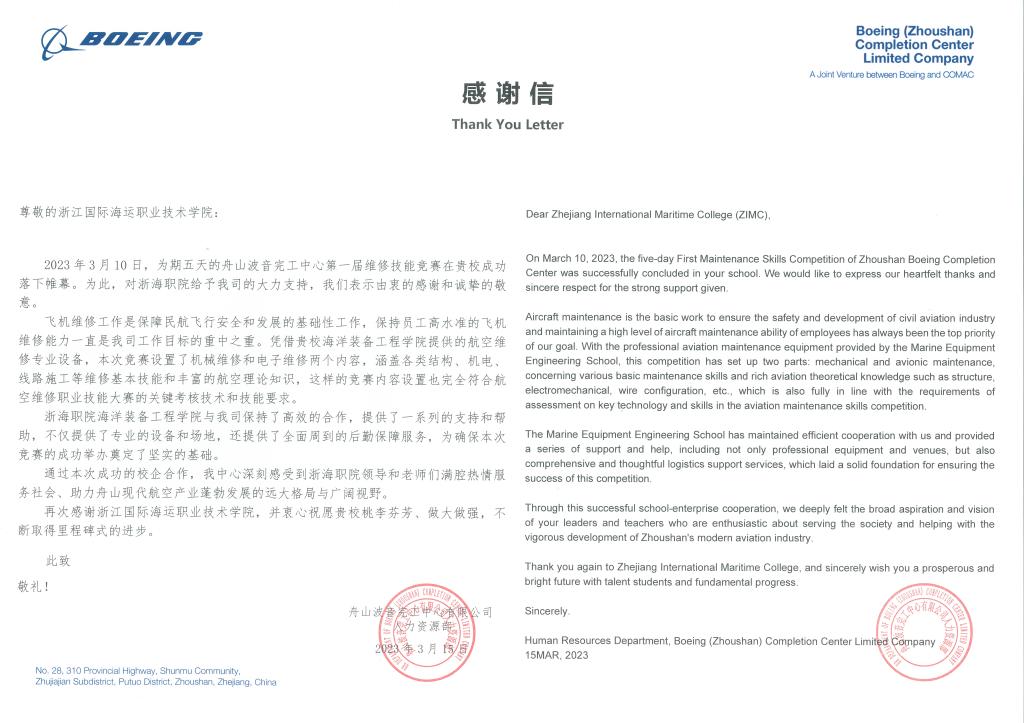 3月16日,舟山波音完工中心有限公司人力资源部高级经理程立树一行特地来校送感谢信,由衷感谢我校对舟山波音完工中心首届维修技能竞赛的成功举办提供了一系列的支持和帮助。校党委委员、副校长夏志刚热情接待了来访客人。