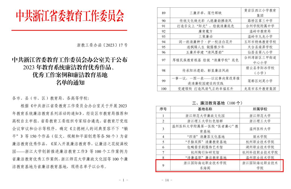 近日,在中共浙江省委教育工作委员会组织开展的2023年教育系统廉洁教育系列活动中,学校纪委组织申报的廉洁教育基地“东海阁”被评为省级廉洁教育基地。