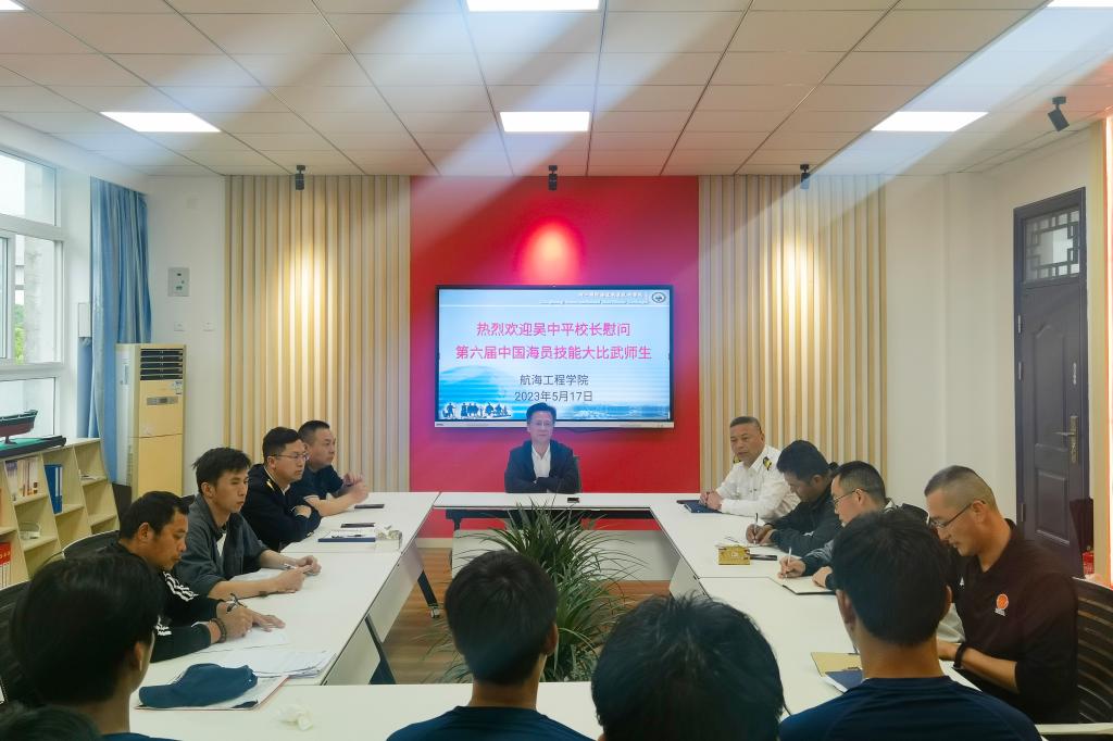 5月17日下午,校党委副书记、校长吴中平看望第六届中国海员技能大比武备赛师生并在海慧楼309会议室举行了师生座谈会。文化体育部部长王智明,航海工程学院院长汪益兵、党总支书记李刚、大比武教练员团队和15名集训队员参加了座谈。