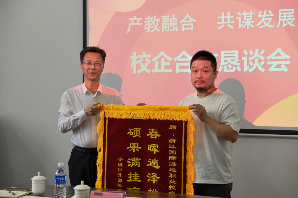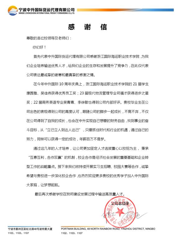 5月31日,宁波中升国际货运代理有限公司总经理郭燕卫一行来到我校,亲自将一封感谢信送到吴中平校长手中,并赠上锦旗,以感谢我校多年来为公司输送优秀人才,为企业发展做出的重要贡献。