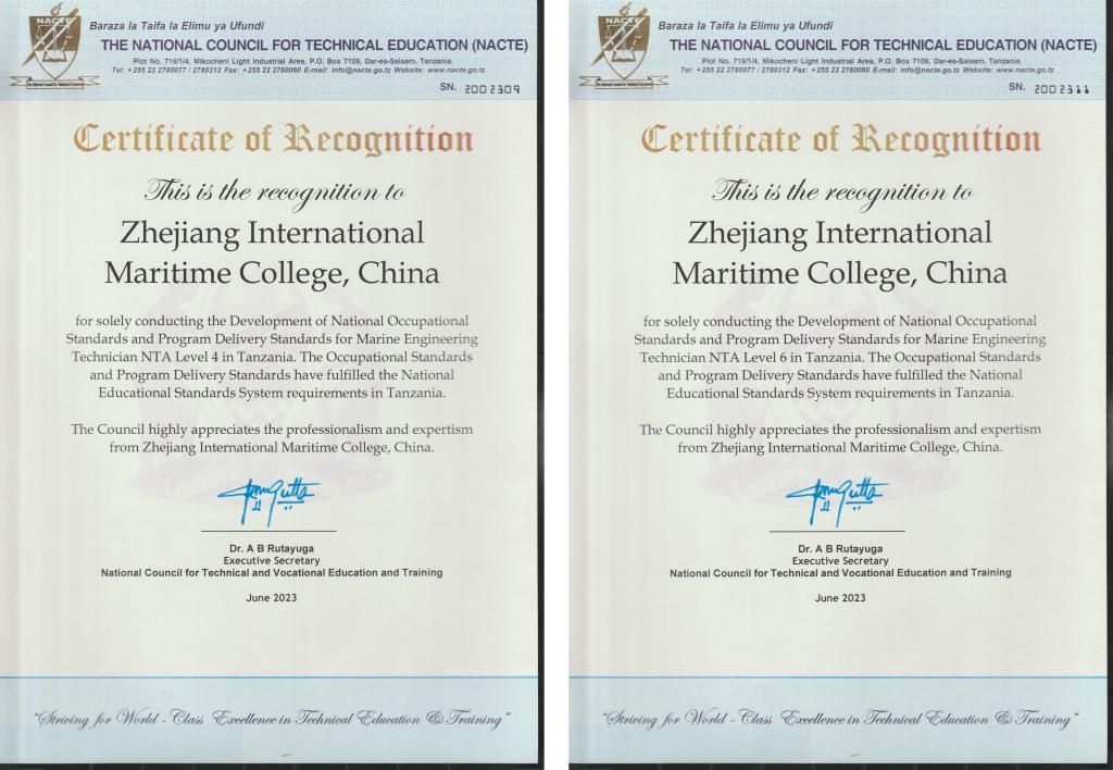 2023年6月,由我校主持、参与的坦桑尼亚职业标准和配套专业教学标准轮机工程技术员4级、轮机工程技术员6级、船舶电子电气技术员4级、船舶电子电气技术员5级、船舶电子电气员6级、石油化工产品技术员4级等6个项目获得坦桑尼亚国家教育委员会认证,正式纳入坦桑尼亚国家职业教育体系。
