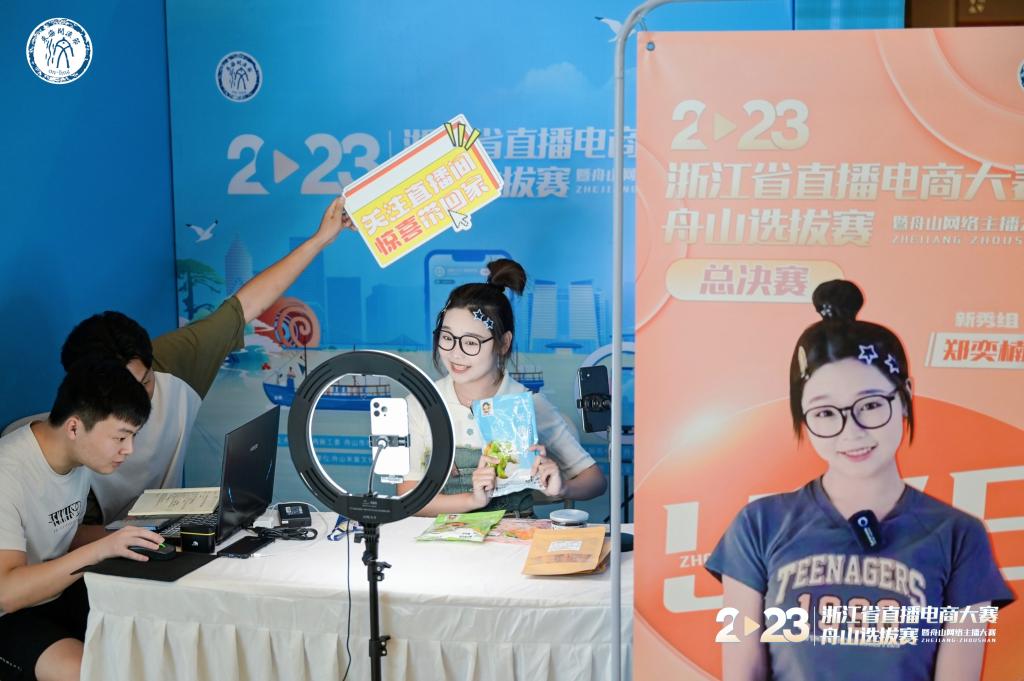 在9月9日的总决赛现场,10组决赛选手开启了1小时的带货直播,带货产品来自企业自营、公共选品库、本地团购等。大赛设置了专业评审团,场外评委根据选手的镜头表现、专业能力、直播互动及成交情况等方面进行综合打分,结合带货单数的降分制赋分,按照分数高低决出最终排名。郑奕楠同学不畏强手,作为年龄最小的参赛选手和非专业学生,利用实习期休息时间,边学习边训练,最终获得总决赛第三名,成功入选舟山市电商直播人才库,同时与舟山头部电商企业签署专属直播合约、参与2023线上东海开渔节系列宣传活动。