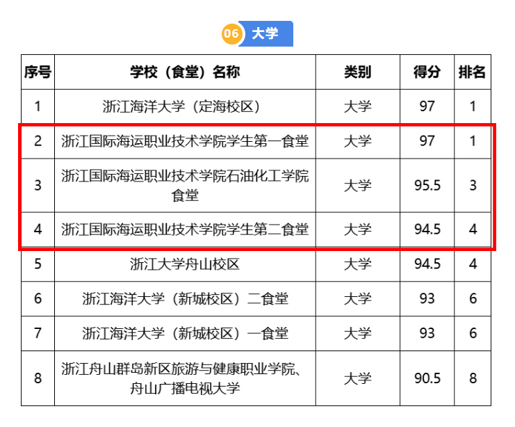 近日,舟山市市场监管局公布了全市2023年秋季开学学校餐饮保障检查结果。我校学生第一食堂、石油化工学院食堂、学生第二食堂在专项检查中分别荣获并列第一名,第三名和第四名。