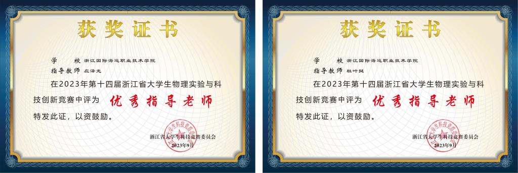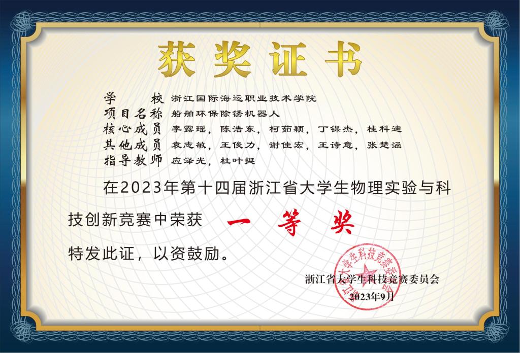 近日,第十四届浙江省大学生物理实验与科技创新竞赛圆满闭幕。本届竞赛共有来自全省63所高校(主赛道43所、职教赛道20所),3135个项目参加初赛,经过初赛和复赛,共选拔出718支队伍进入决赛,职教赛道共164个项目入围决赛,其中91个项目进入作品展示与答辩环节。经过激烈角逐,我校海洋装备工程学院学子在赛项中斩获佳绩,获得了一等奖1项、三等奖2项的好成绩,应泽光、杜叶挺两位老师在此次竞赛中被评为优秀指导教师。