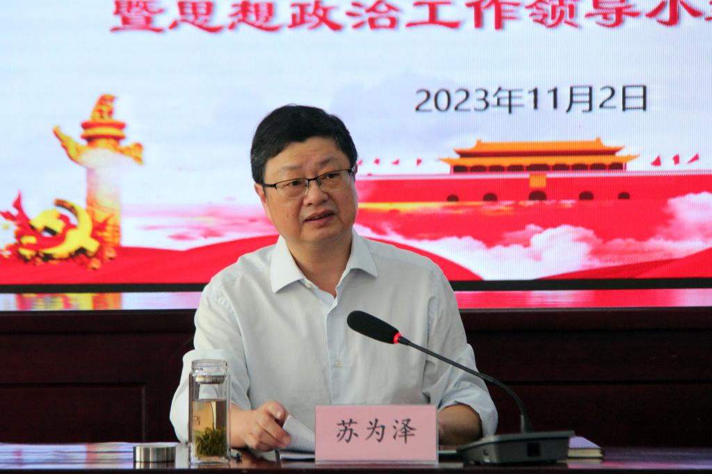 苏为泽书记表示,学校思想政治工作机制逐步健全、队伍不断壮大、效果不断显现,思想政治工作积累了新的经验、取得了新的成绩。他结合学校实际,指出了目前学校思想政治工作所存在的不足,并对下一步学校思政工作的开展提出了两点要求:一是推进思政课改革创新。学好讲好教材、躬行实践,打造大课堂、办好思政课关键在教师、推进大中小学思想政治教育一体化建设;二是深刻把握新形势落实新要求,抓紧抓牢理论学习,要深刻领会习近平文化思想的重大意义和丰富内涵、要坚决扛起文化建设使命、要全面提升宣传思想工作质效。
