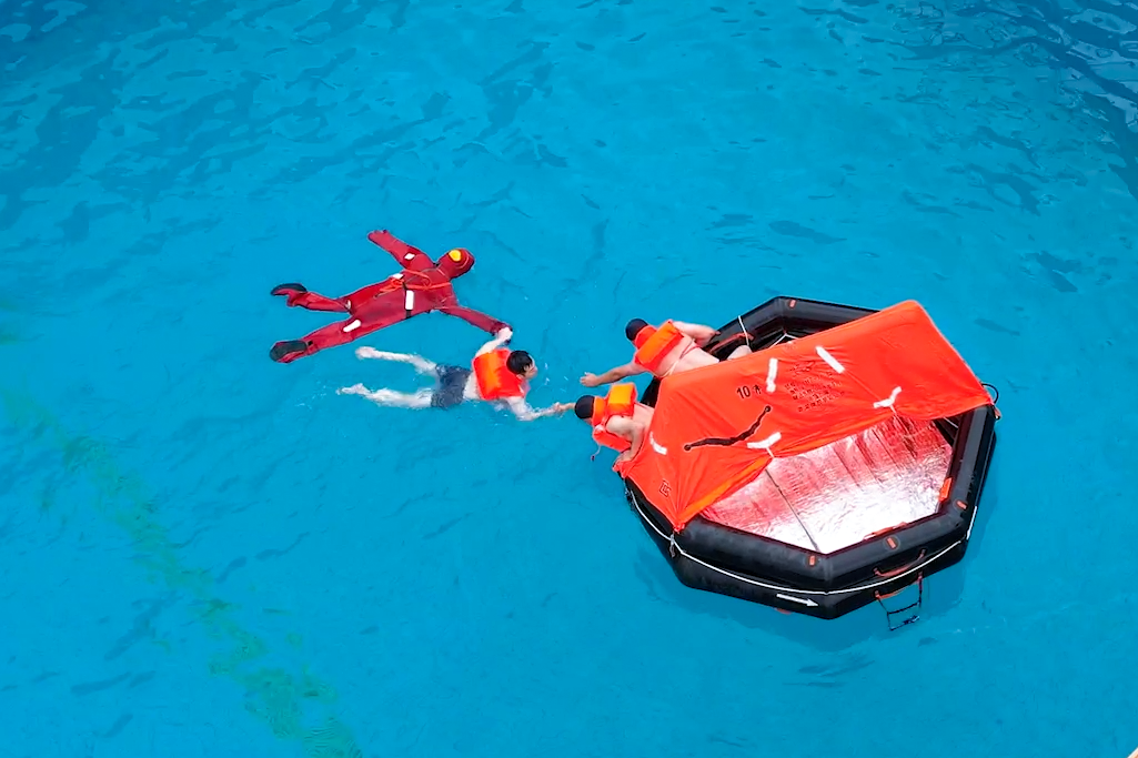 每支代表队派4名队员正确穿着救生衣,其中,2名队员按照规定跳水姿势跳入水中,浮出水面后游向救生筏,两人共同扶正救生筏并进入筏内,随后其他2名在水中待命的队员,其中1人拖模拟人游向救生筏,并与筏内队员配合将模拟人放入筏内,另一名队员游向救生网并按铃,比赛结束。