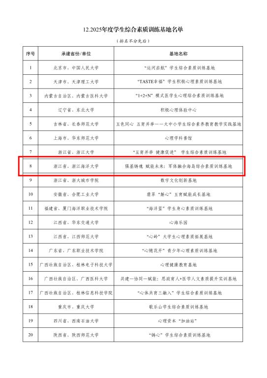 4月7日,我校文化体育部二级教授黄永良作为项目的总策划与设计者(第三参与人),由浙江海洋大学申报的《强基铸魂 赋能未来:军体融合海岛综合素质训练基地》学生综合素质训练基地项目,获得教育部2025年度高校思想政治工作质量提升综合改革与精品建设项目(全国20项),实现了我校该类国家级项目零的突破。(文化体育部)