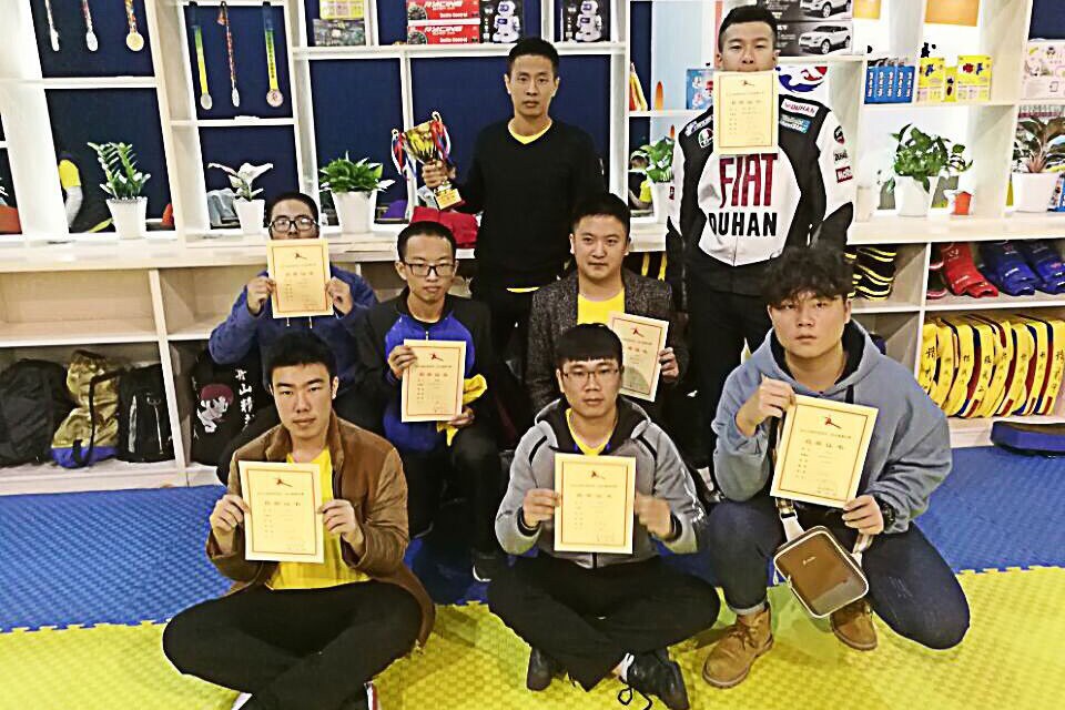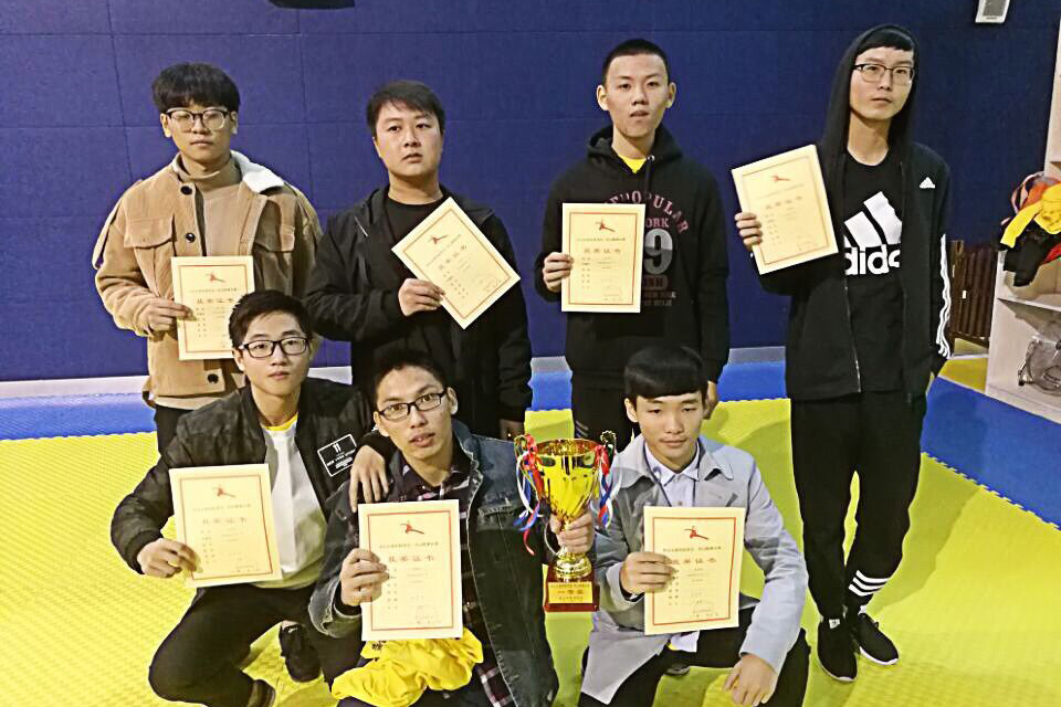船舶工程学院精武社2支队伍参加比赛,15名队员在背景音乐《男儿当自强》的陪衬下,整齐的动作和磅礴的气势使得裁判连连点头,分别赢得了一等奖和二等奖。