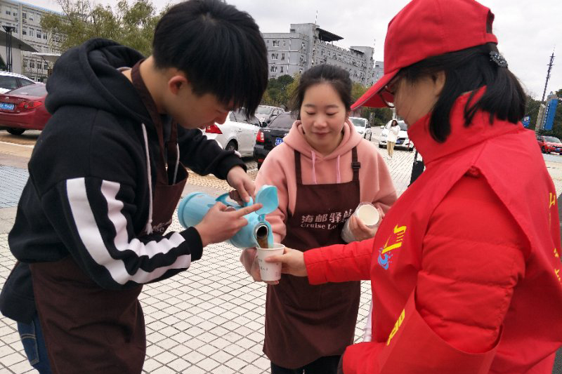 姜茶不多,却代表了海洋旅游学院满满的心意,以此向辛勤付出的志愿者师生道声感谢。舟山有你,越来越好!海运有你,越来越好!(海洋旅游学院)