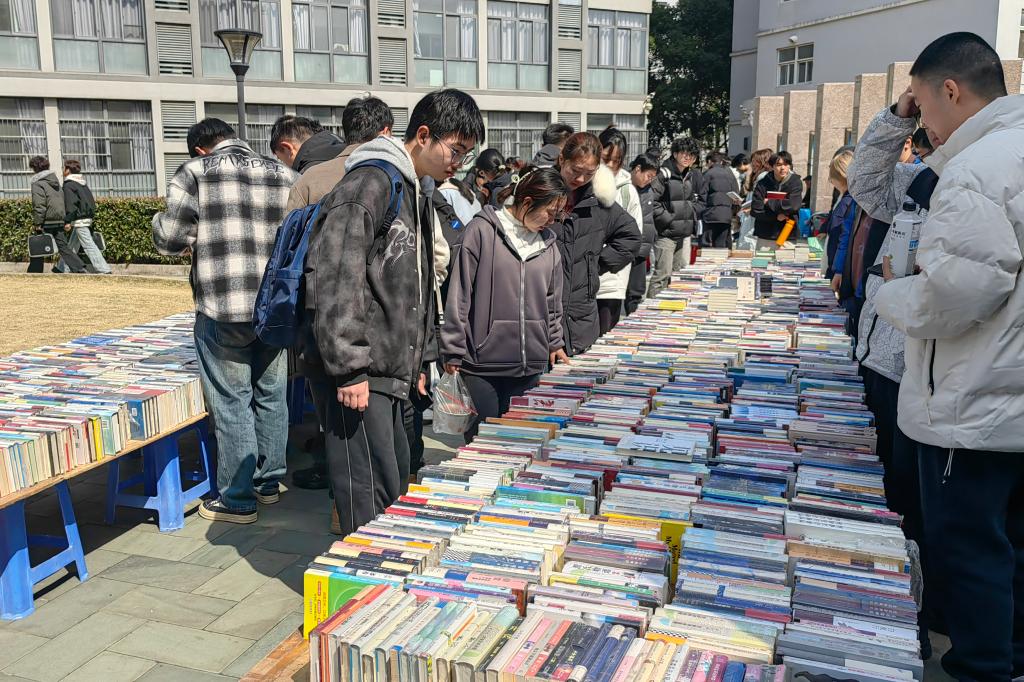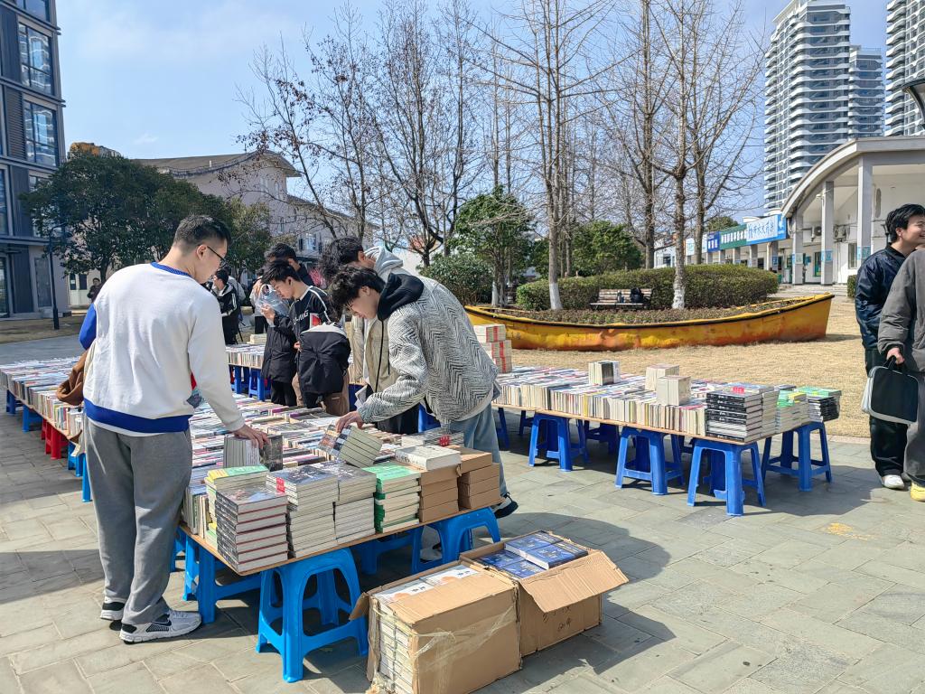 墨卷至恒,书香致远。春风向暖的午休时光,大批学生穿梭于各类书摊前,挑选心仪图书,阅读、交流……你来我往间结下了共享好书、传递快乐的情谊。老师们也被这浓郁的书香氛围所感染,纷纷加入阅书、购书的大军行列,全校师生尽情享受着淘书的乐趣!