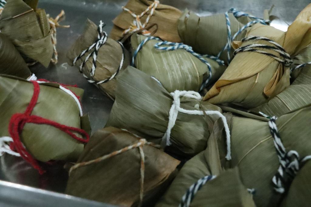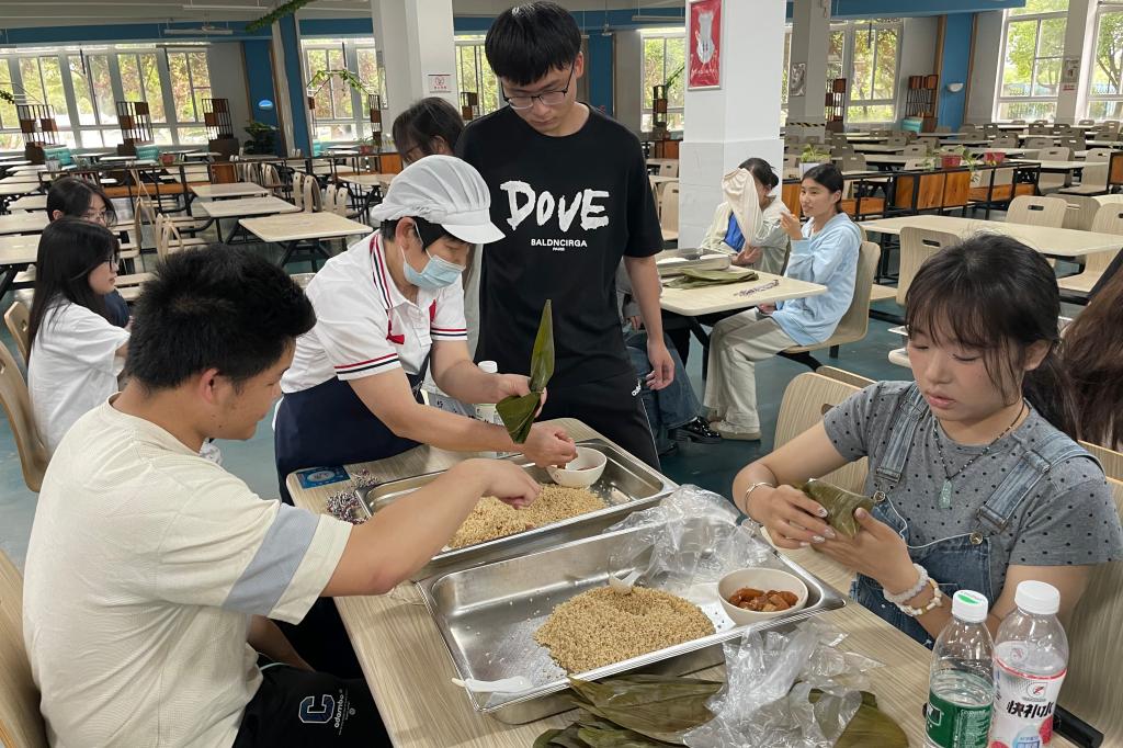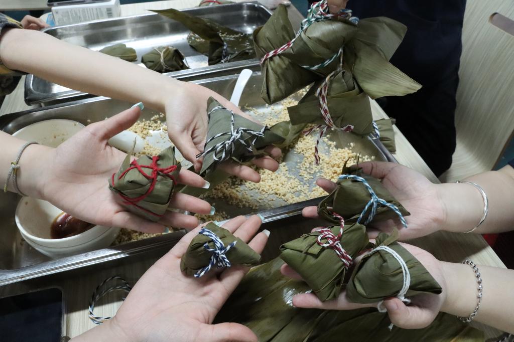 当天下午,活动参与者们齐聚学生食堂,4-6人为一组,他们个个摩拳擦掌,各自挑选了甜、咸糯米,咸蛋黄、鲜肉、红枣、豆沙等馅料,在工作人员的细致教授下,同学们逐渐掌握了包粽子的要领,一个个或小巧或饱满的粽子逐渐成型,再扎上五彩的绳线,心中是满满的成就感。活动结束后,同学捧着蒸熟的粽子,眼里满是欣喜,纷纷表示要带回寝室送给自己的室友尝一尝。