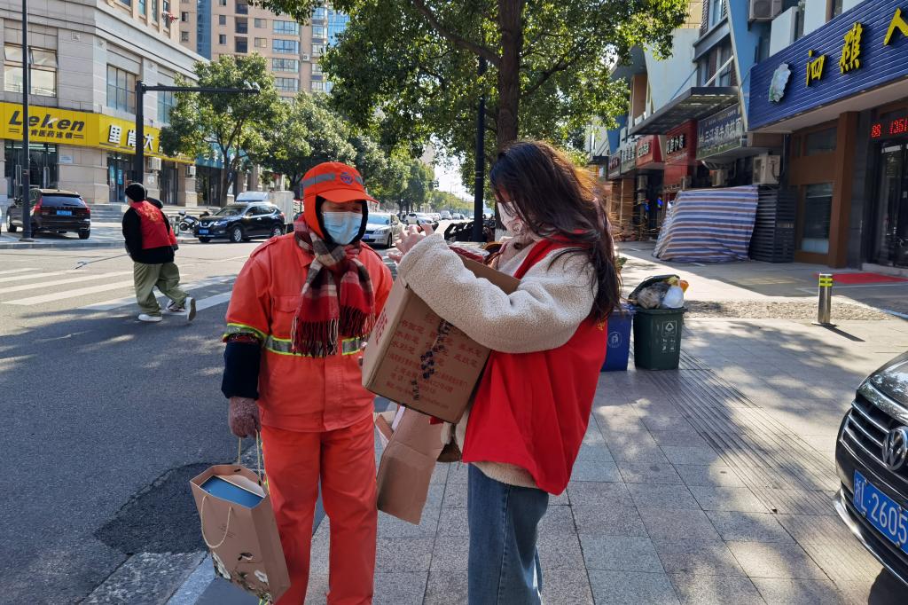凛冽寒风送温暖,缕缕关爱暖人心。12月26日,学校公益社的志愿者们开展了“‘卫’爱同行,温暖我心”公益行活动,为严寒冬日里奋斗在一线的城市英雄——环卫工人、交通协管员们送上手套围巾等防寒物品,并向市民宣传保护环境生态的理念。