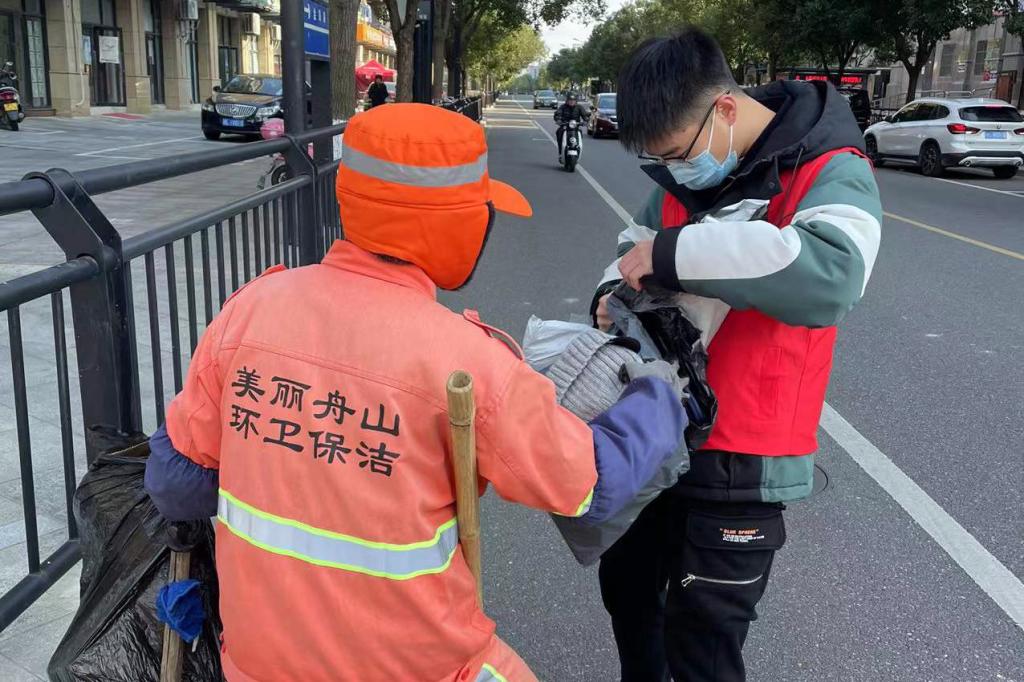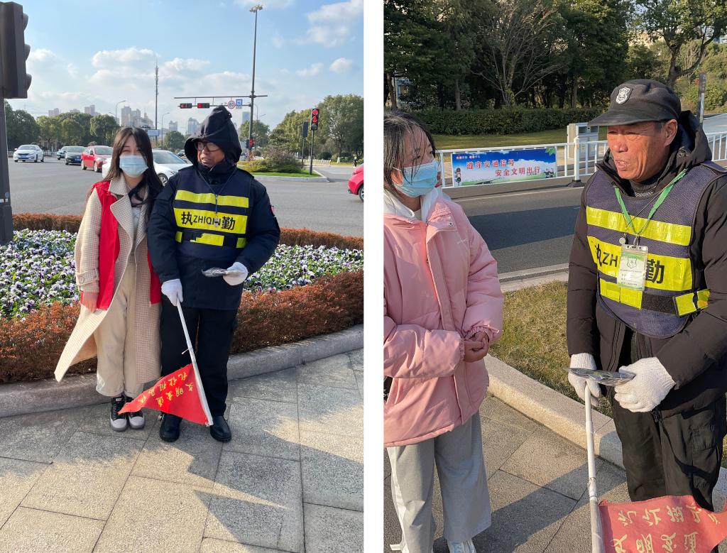 当天下午,公益社的23名志愿者冒着寒风,带着物资与满满爱心从学校出发,将准备好的防寒物品送到交通协管员与环卫工人手中,微笑着送上了温暖的感恩话语。志愿者们帮助环卫工人清扫地面、捡拾垃圾,还向路上市民及沿街商铺发放传单,呼吁大家共同为美好城市环境建设助力。