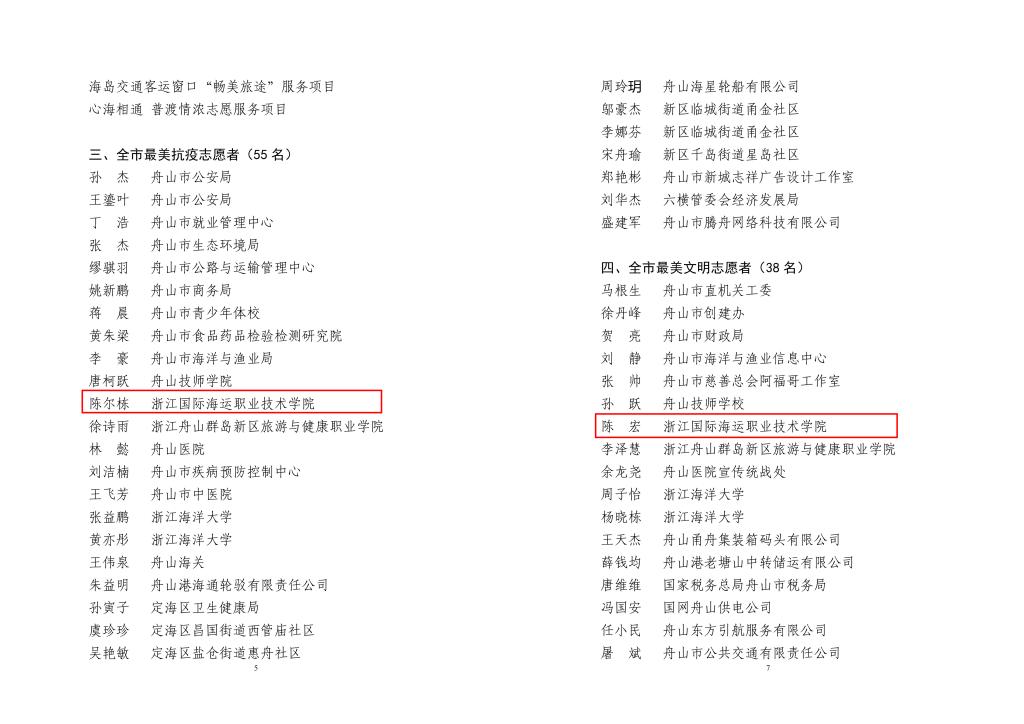 近日,2021年度舟山市志愿服务“最美”系列典型选树结果揭晓,我校海洋旅游学院青年志愿者队荣获“全市最美志愿服务组织”、陈尔栋老师荣获“全市最美抗疫志愿者”、学子陈宏荣获“全市最美文明志愿者”。