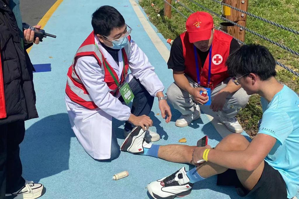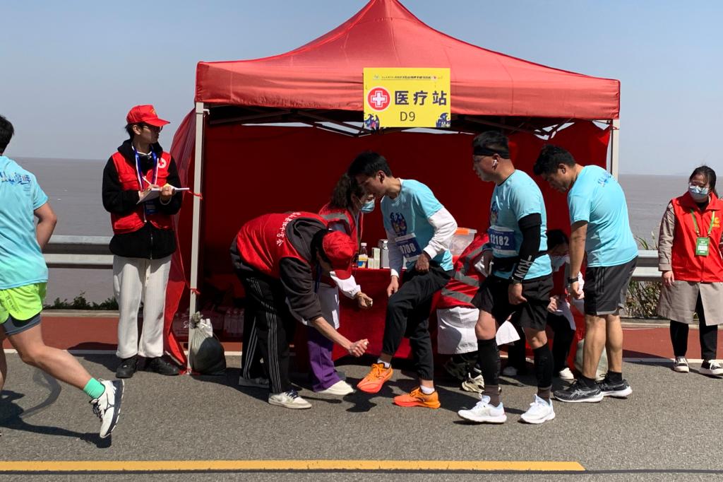 全体志愿者凌晨5点出发,提前到岗。竞赛组的志愿者有序保管参赛人员物品,并引导参赛选手进入起跑区域。包括石化“启航”救护队在内的医疗志愿者们身穿带有红十字标志的统一服装坚守在赛道沿线值守随时待命。