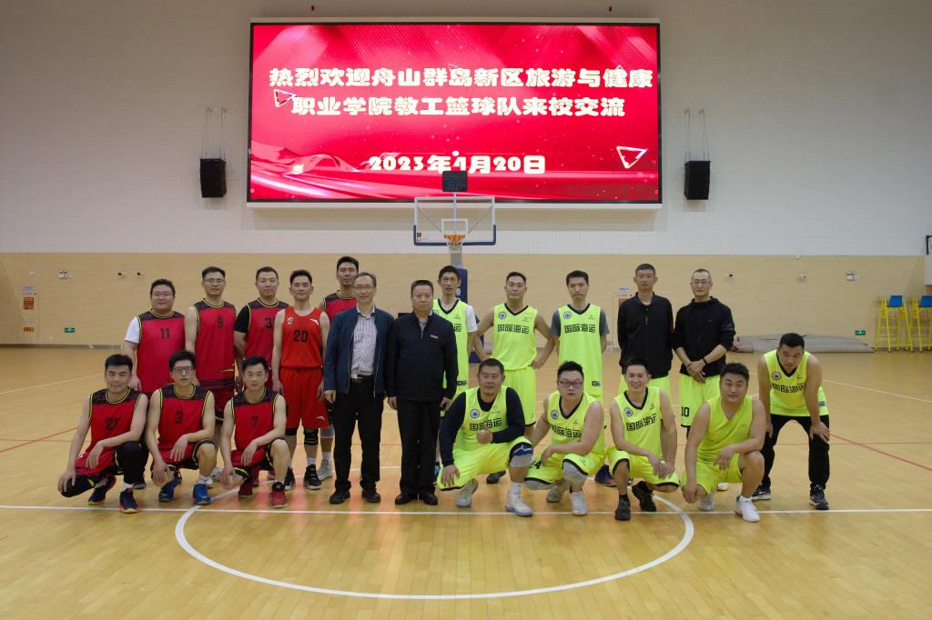 4月20日晚,我校工会联合文化体育部与浙江舟山群岛新区旅游与健康职业学院工会共同举行的教职工篮球友谊赛在我校体育馆顺利举行。舟旅健工会主席张朝阳、副主席叶勇敏,我校党委副书记孔志光,副院长李丽,党委委员、校工会主席刘相,校办公室主任赵晖,文化体育部王智明和部分师生代表观看了比赛。