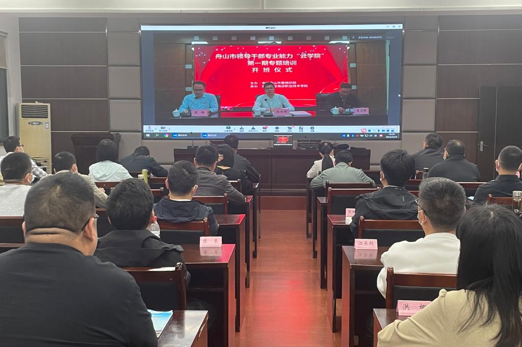 为进一步提高舟山市各级领导干部全力推进创新深化改革攻坚开放提升的能力和水平,市委组织部创新推出的领导干部专业能力“云学院”落户我校。5月24日,“云学院”第一期优化营商环境专题培训在我校顺利举办,舟山市委组织部副部长陈杰辉,我校党委委员、副校长夏志刚及全市700余名干部参加开班仪式并参与学习,仪式由东海教育学院院长苏峰主持。
